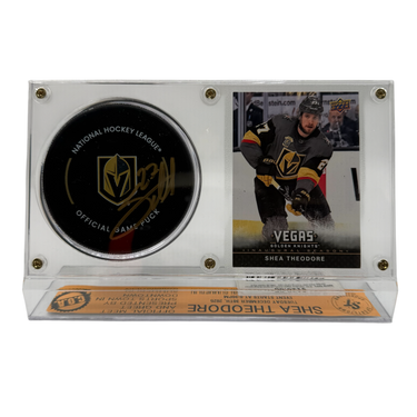 Shea Theodore Vegas Golden Knights Autographed Hockey Puck and Trading Card Case - Official Game Puck