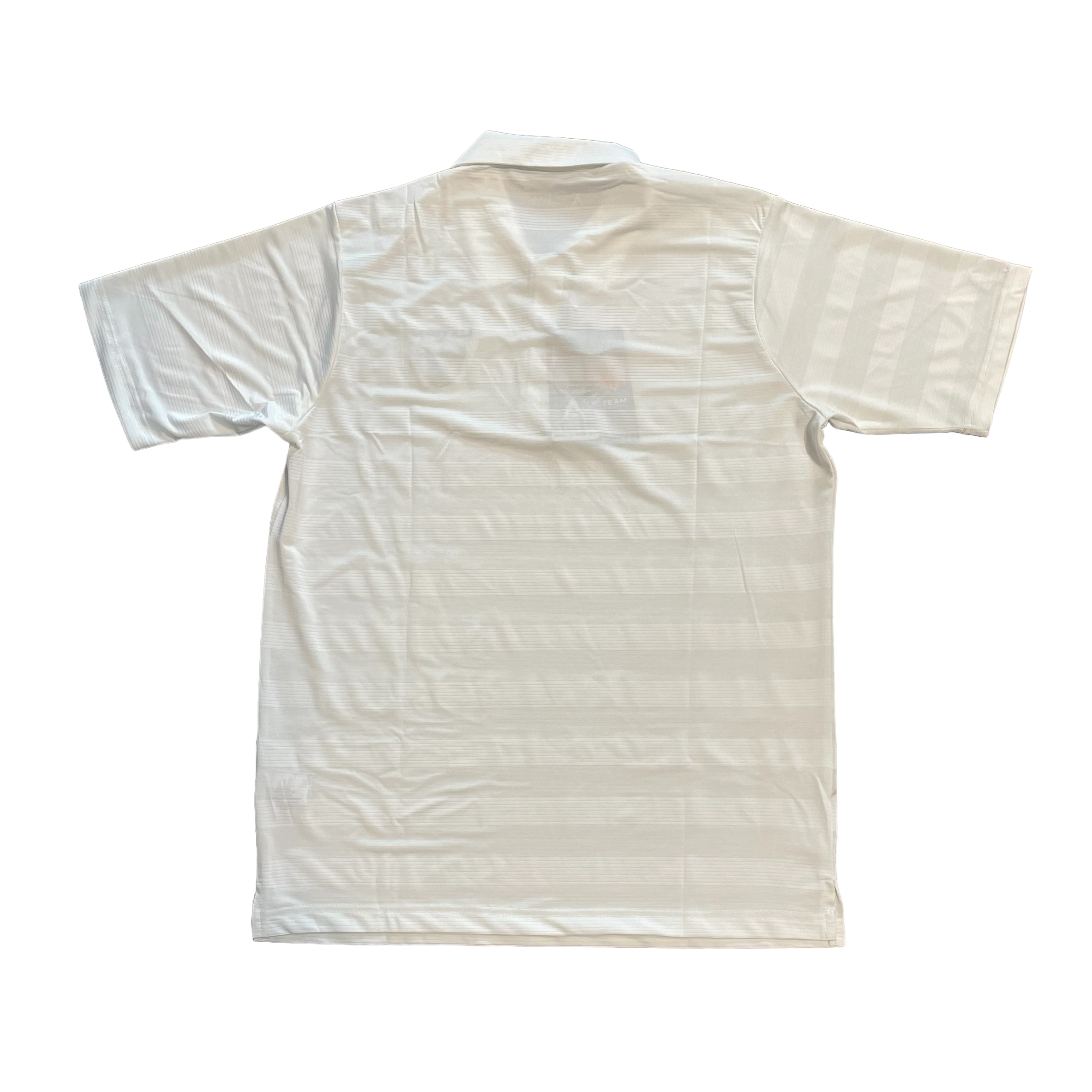 A 95%Polyester/5% spandex tonal stripe short sleeve polo with self fabric collar, open cuff, narrow 3 button placket and side slits. Antigua triangle patch at right cuff. Lightweight breathable material.