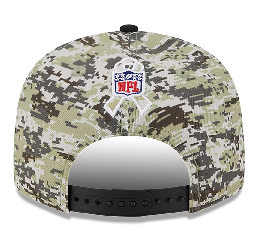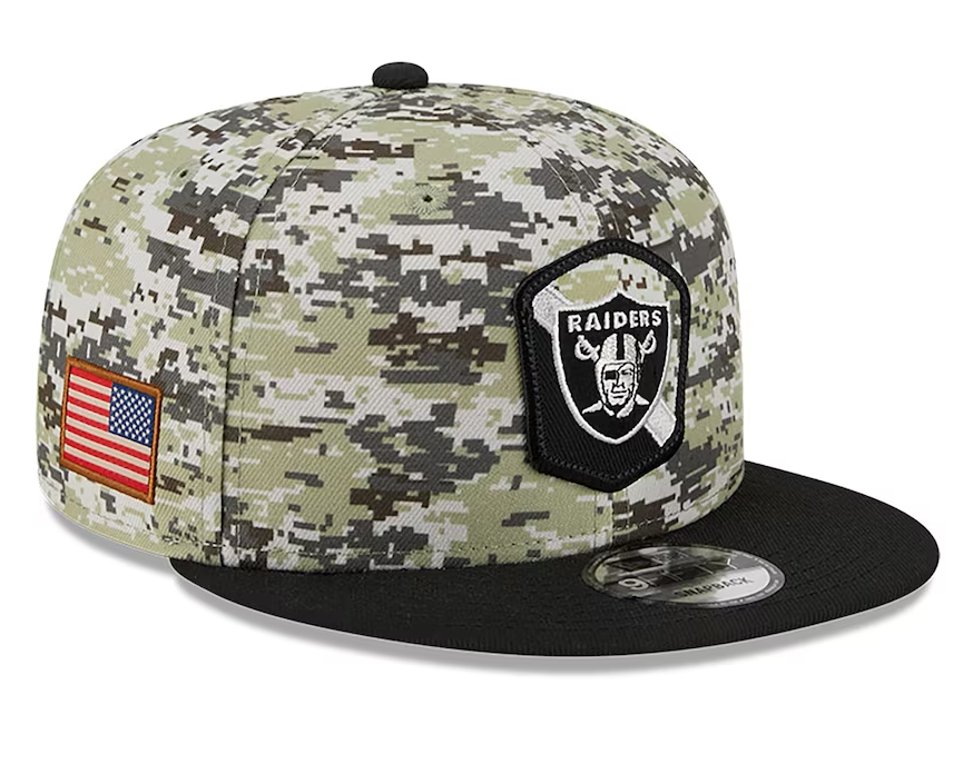 Honor our service members while supporting the Las Vegas Raiders with this 2023 Salute To Service 9FIFTY Snapback Hat. This New Era hat features a camo crown and undervisor and displays an embroidered Las Vegas Raiders logo at the front panels. The official NFL Salute to Service patch is embroidered above the snapback closure at the rear, while an American Flag patch is displayed at the right-wear side. The NFL does not profit from the sale of Salute to Service products. Charitable contributions are awarded by the NFL Foundation to the NFL's military nonprofit partners. For more information, please visit www.NFL.com/causes/salute.