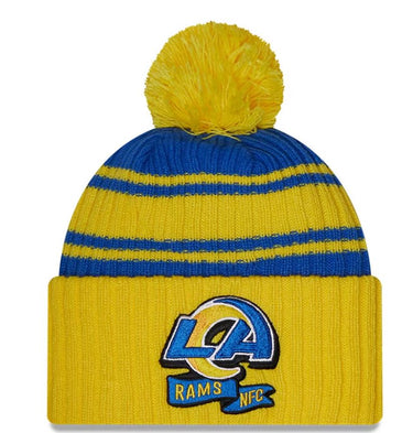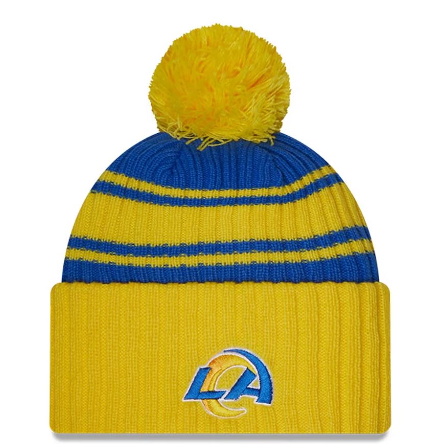 Los Angeles Rams New Era 2022 Sideline Blue/Gold Cuffed Pom Knit Beanie