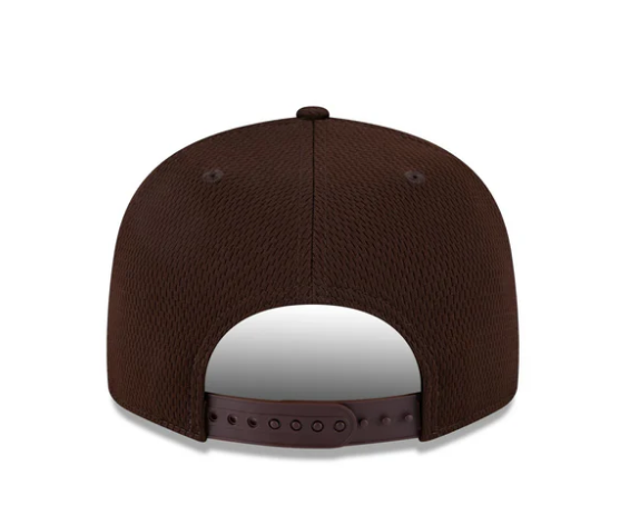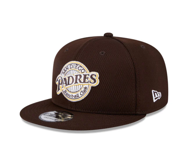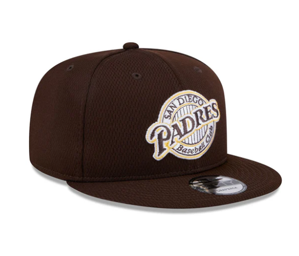 The San Diego Padres 2025 Clubhouse Alt 9FIFTY Snapback features an embroidered Padres alternate logo at the front panels with a dashmark mesh fabrication throughout. Additional details include a snapback closure at the rear and a silicone logo on a gray undervisor.