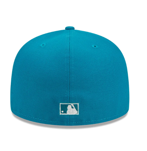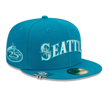 The Seattle Mariners City Flag 59FIFTY Fitted Cap features an embroidered Mariners logo at the front panels with a matching MLB Batterman logo at the rear. Additional details include a 25th Anniversary patch at the right-wear side with a city flag visor clip and gray undervisor.