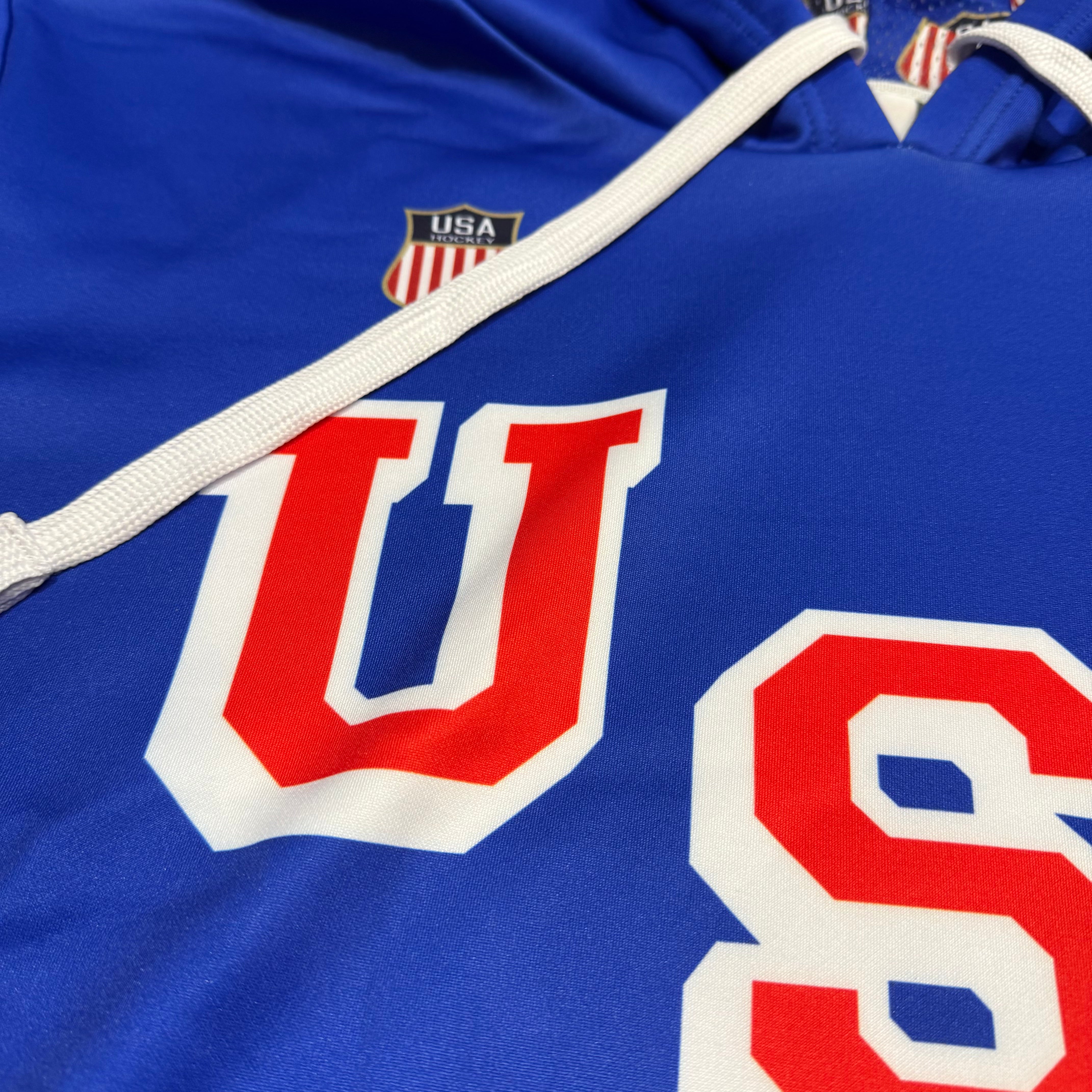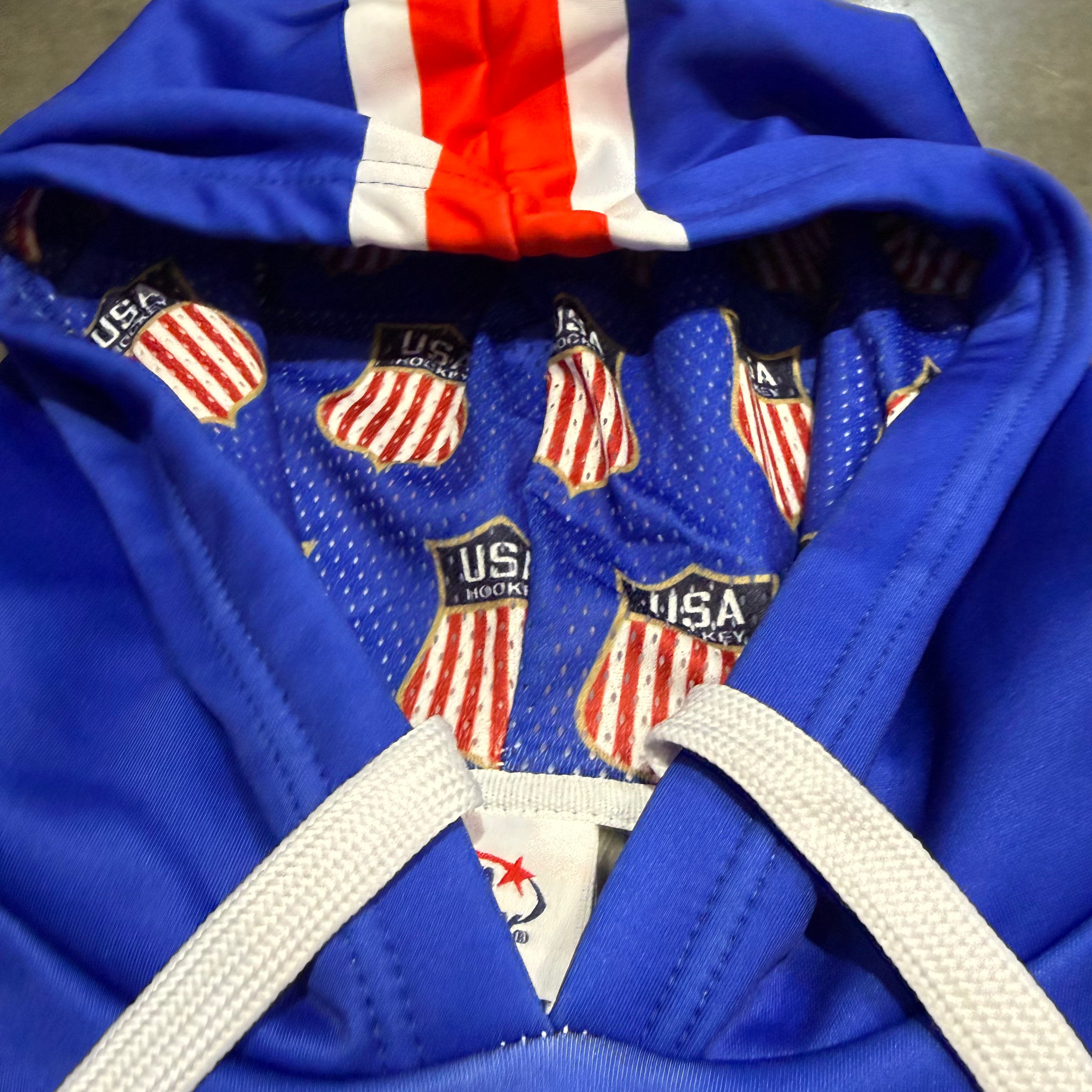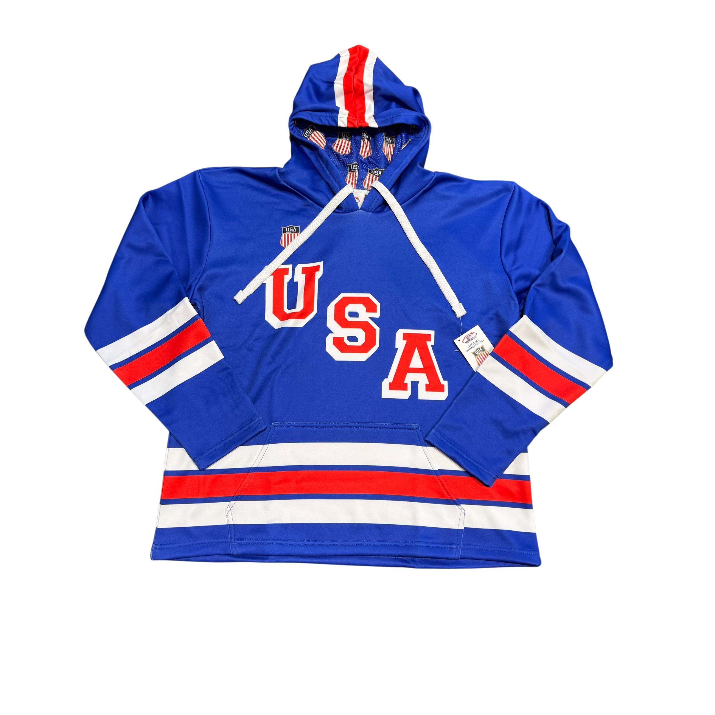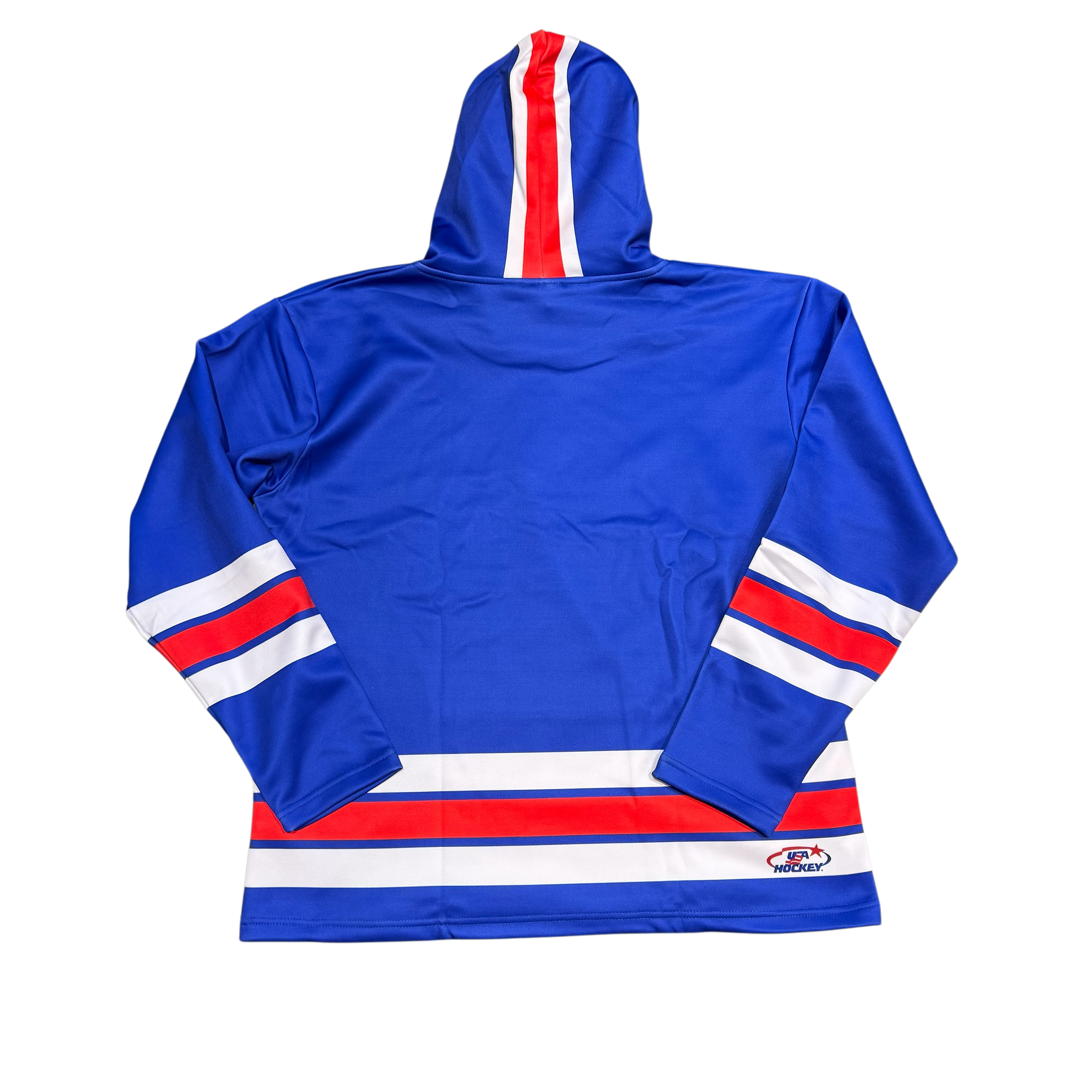 Step up your game with the USA Hockey Jersey Hoodie! Designed to keep you comfortable and stylish, this sleek Blue hoodie features the iconic USA Hockey shield, perfect for showing off your team pride. Lightweight and moisture-wicking, it moves with you whether you're on the ice or off. Stay warm, stay cool, and let your passion for hockey shine with this playful and performance-ready hoodie!